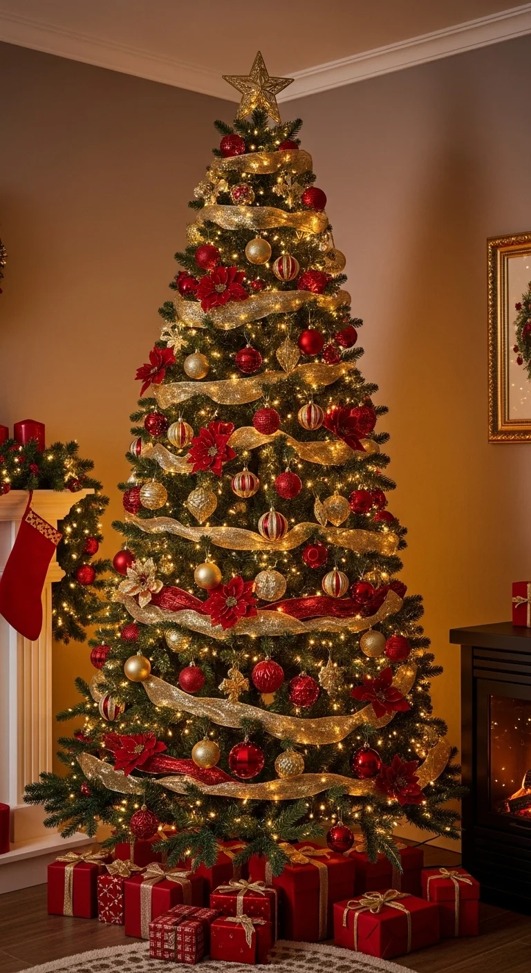 You can never go wrong with the traditional red and gold theme. Use deep red ornaments, gold ribbons, and a mix of shiny and matte finishes. Add warm white lights for a soft glow. To keep it budget-friendly, buy plain ornaments and spray-paint them gold. Finish with a red velvet tree skirt for a timeless look that feels rich and joyful.