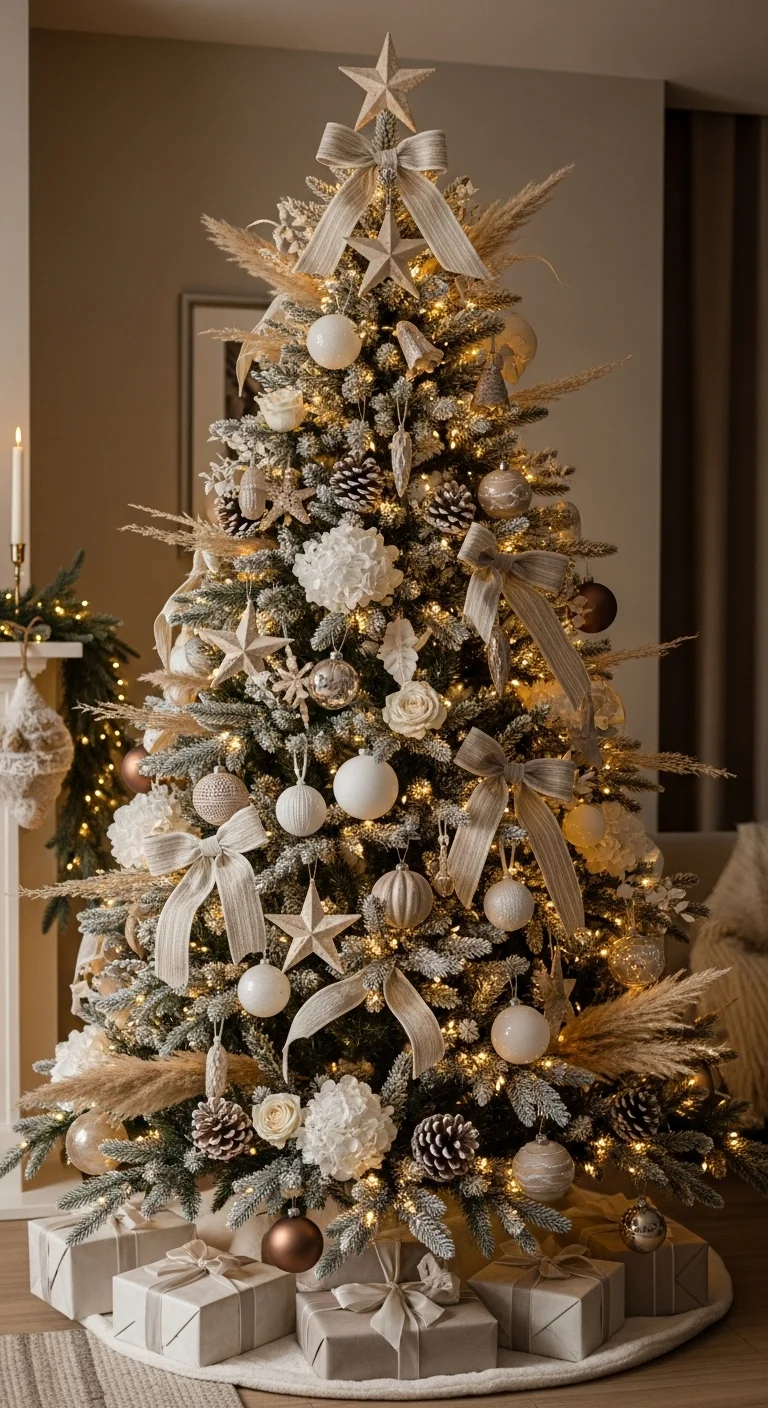 If you live near the coast or love the beach, go for a soft ocean theme. Use light blue, sand, and white tones. Decorate with shells, starfish, and raffia bows. It feels airy and fresh—like Christmas by the sea.