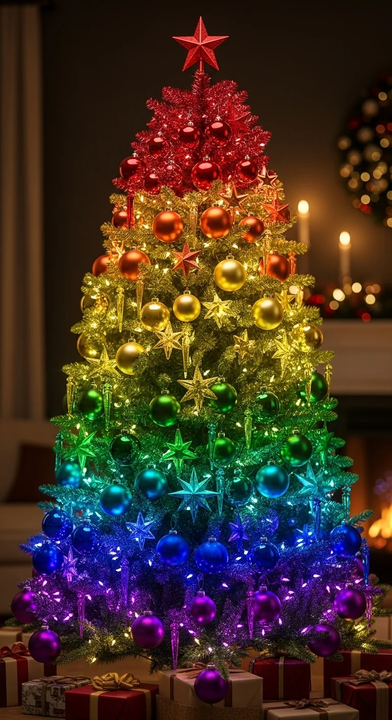 Use a gradient of colors—red at the top, flowing through orange, yellow, green, blue, and purple. It’s bright, cheerful, and perfect if you love color. You can make DIY paper ornaments to keep it affordable and fun.