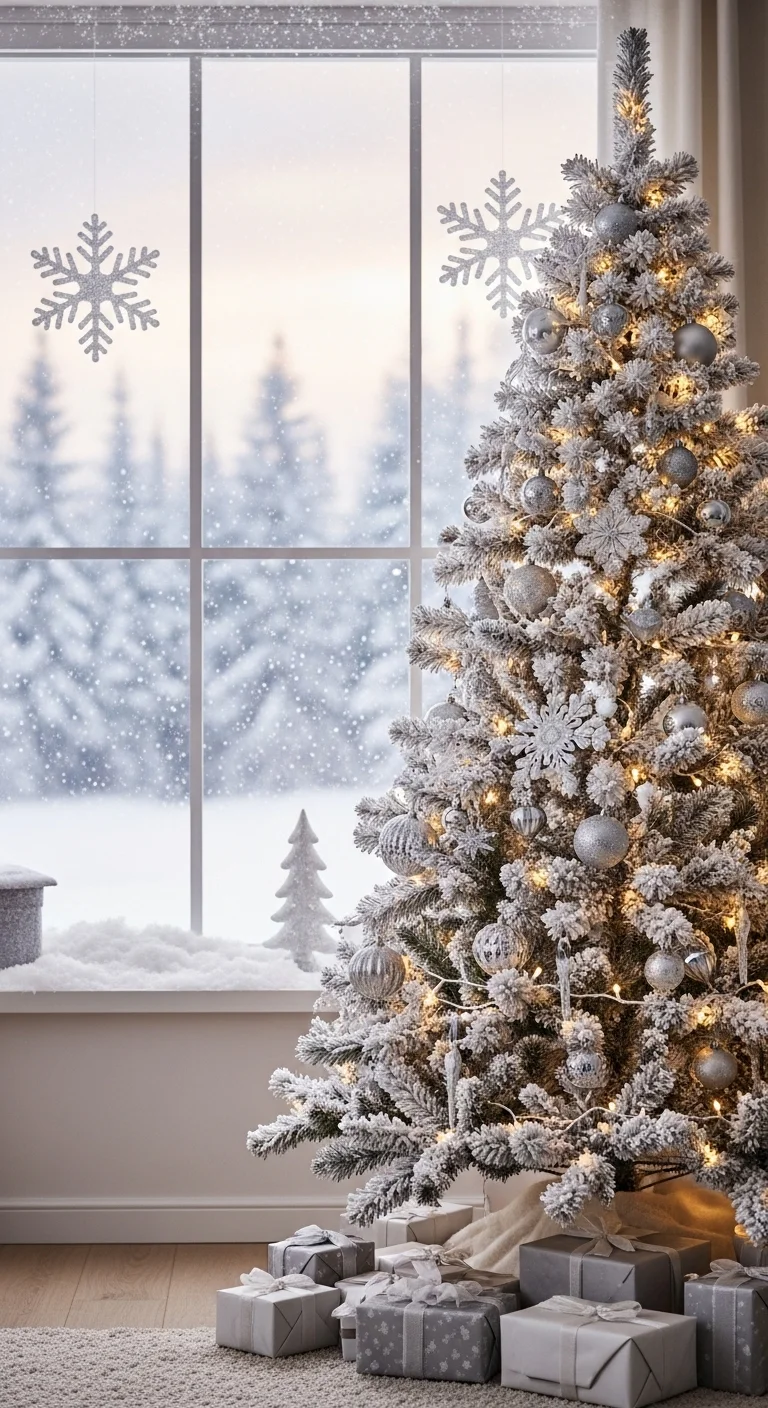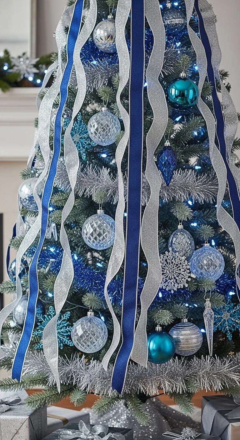 Combine silver and icy blue for a frosty, elegant tree. Add snowflake ornaments and shimmering ribbon. It looks crisp and wintery—like a frozen wonderland inside your home.