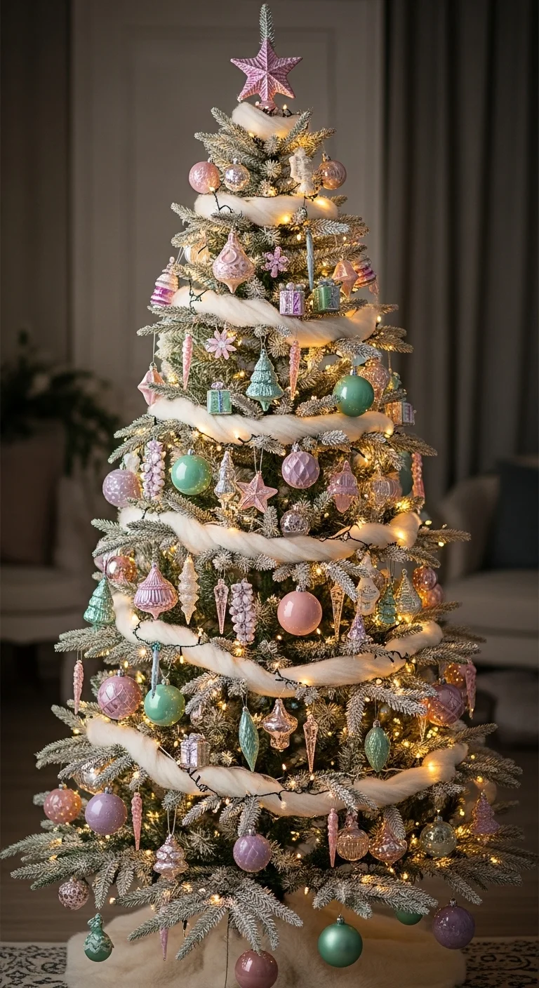 Try pastel colors for a dreamy look. Think pink, mint, and lavender ornaments with white lights. You can add tulle garland or fluffy pom-poms. It’s soft, fun, and feels like a sugar dream.