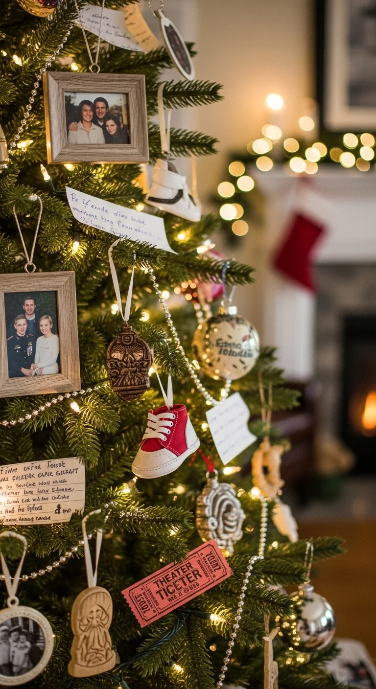 Hang photo ornaments, handwritten messages, and small mementos. Each ornament tells a story. You can make photo baubles with clear plastic ornaments and printed pictures. It’s sentimental and unique to your family.