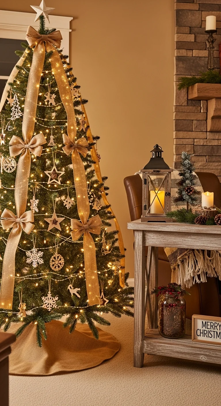 Go natural with burlap, twine, and wooden ornaments. Add pinecones and small handmade stars. Use warm lights instead of colored ones to keep it cozy. You can even craft ornaments from cinnamon sticks or dried oranges. It’s budget-friendly and smells amazing.