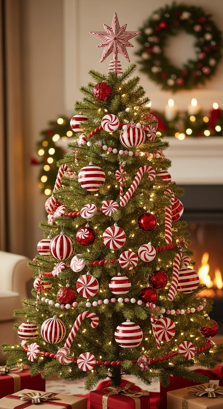 Turn your tree into a candy dream with red-and-white stripes. Hang real or faux candy canes and peppermint ornaments. Add red ribbons spiraling down the tree. It’s playful, cheerful, and fun for families with kids.
