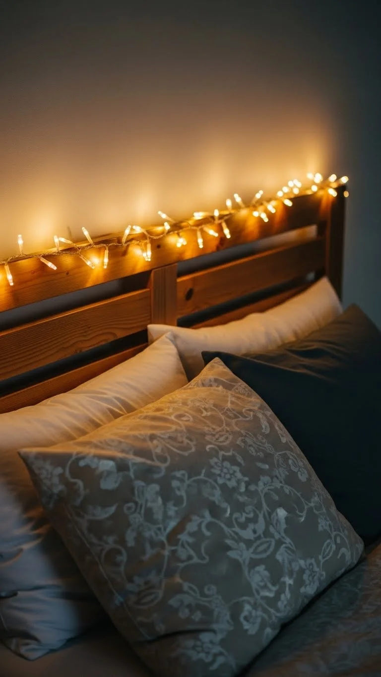 Drape string lights along your headboard for a gentle, cozy glow. Choose warm white lights to create a relaxing atmosphere. Affordable options include LED string lights or battery-operated versions. You can secure them with small hooks or clips. This simple addition transforms the bed into a magical focal point, perfect for reading or winding down.