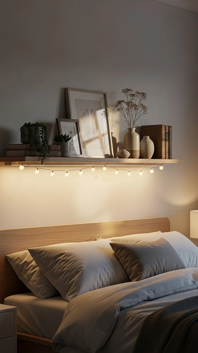 Line floating shelves with small LED lights to highlight decorations. Affordable and easy to mount. Great for books, ornaments, or framed photos. This adds layered lighting and brings a magical, cozy feeling to the bedroom.