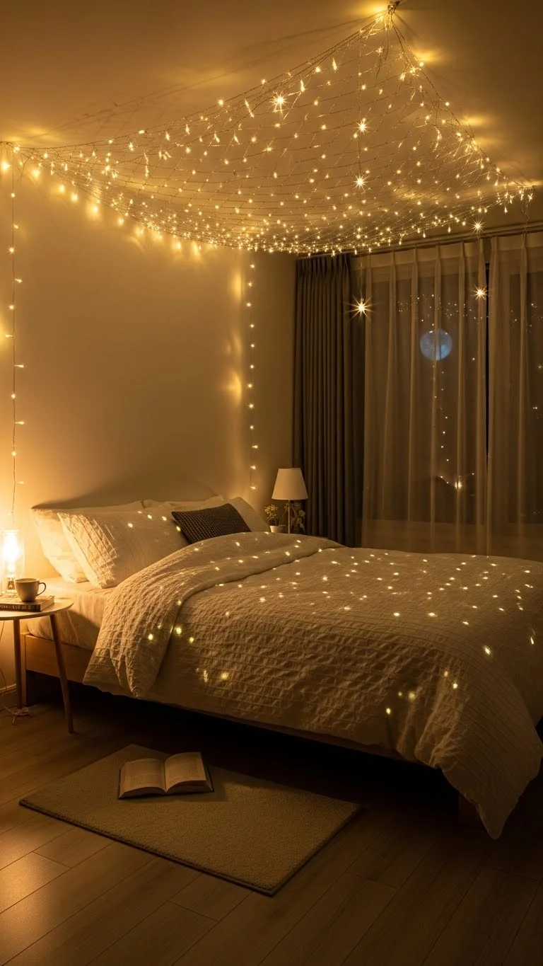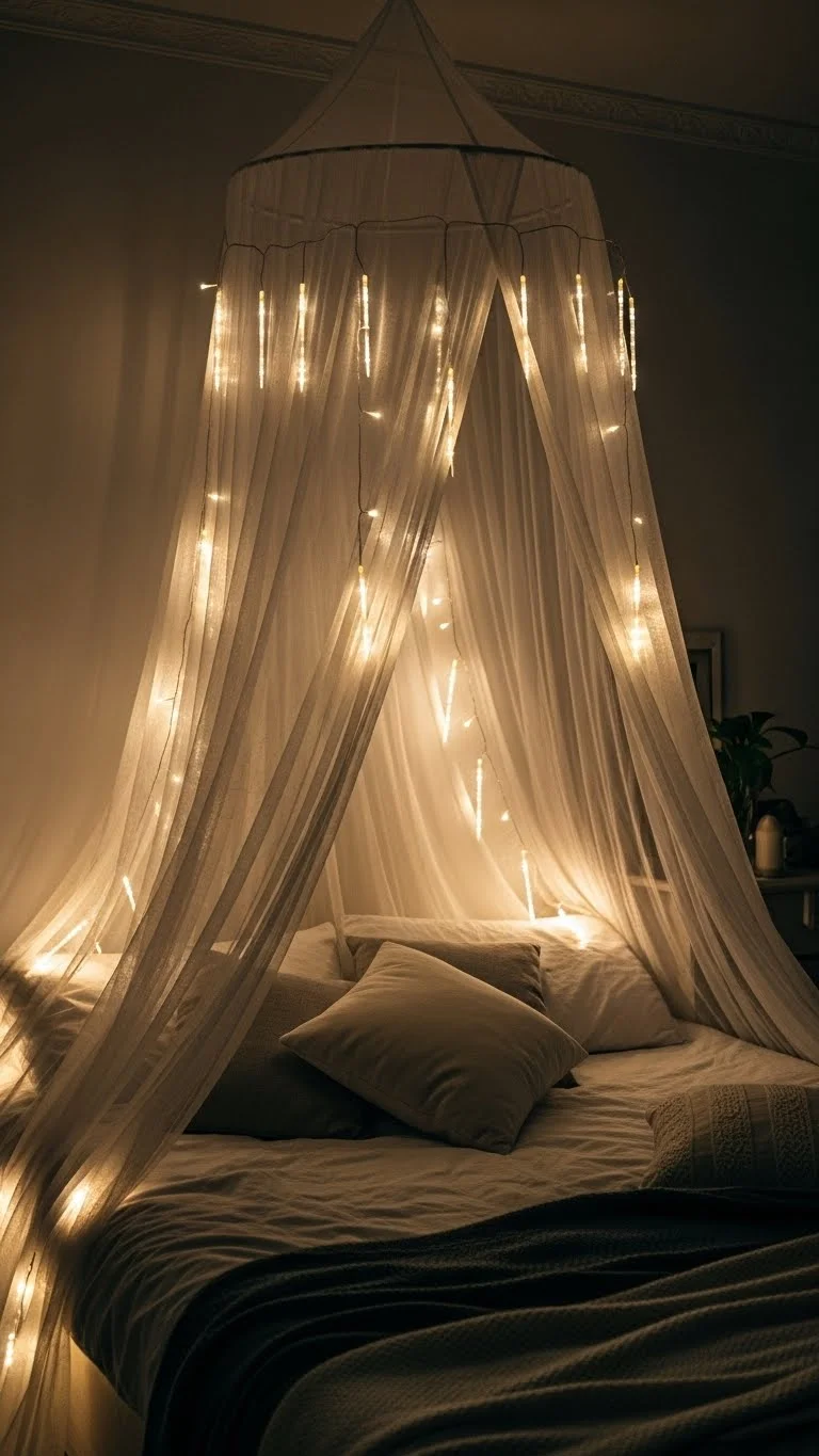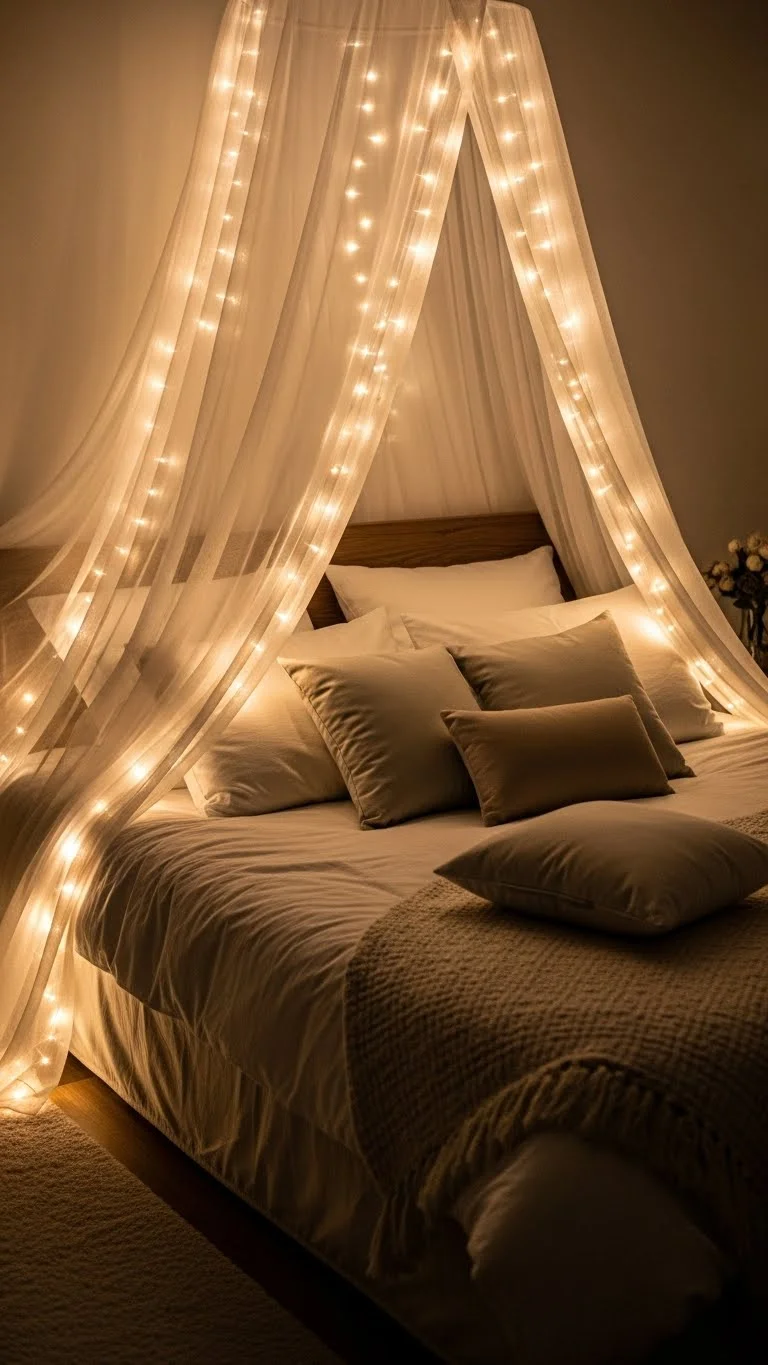 Weave fairy lights into a bed canopy for an ethereal effect. Use lightweight lights so the fabric drapes easily. Affordable DIY: attach battery-powered strands with small clips or tape. The soft glow makes the bedroom feel cozy and enchanting, ideal for quiet nights or holiday relaxation.