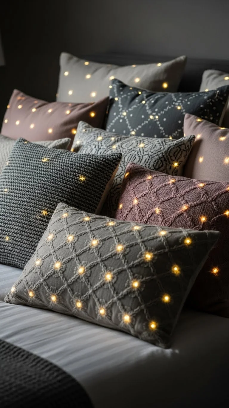 Use pillows with built-in LED lights for subtle illumination. Affordable DIY: insert battery-operated string lights into pillowcases. Adds a playful, cozy glow, especially for lounging or reading in bed.