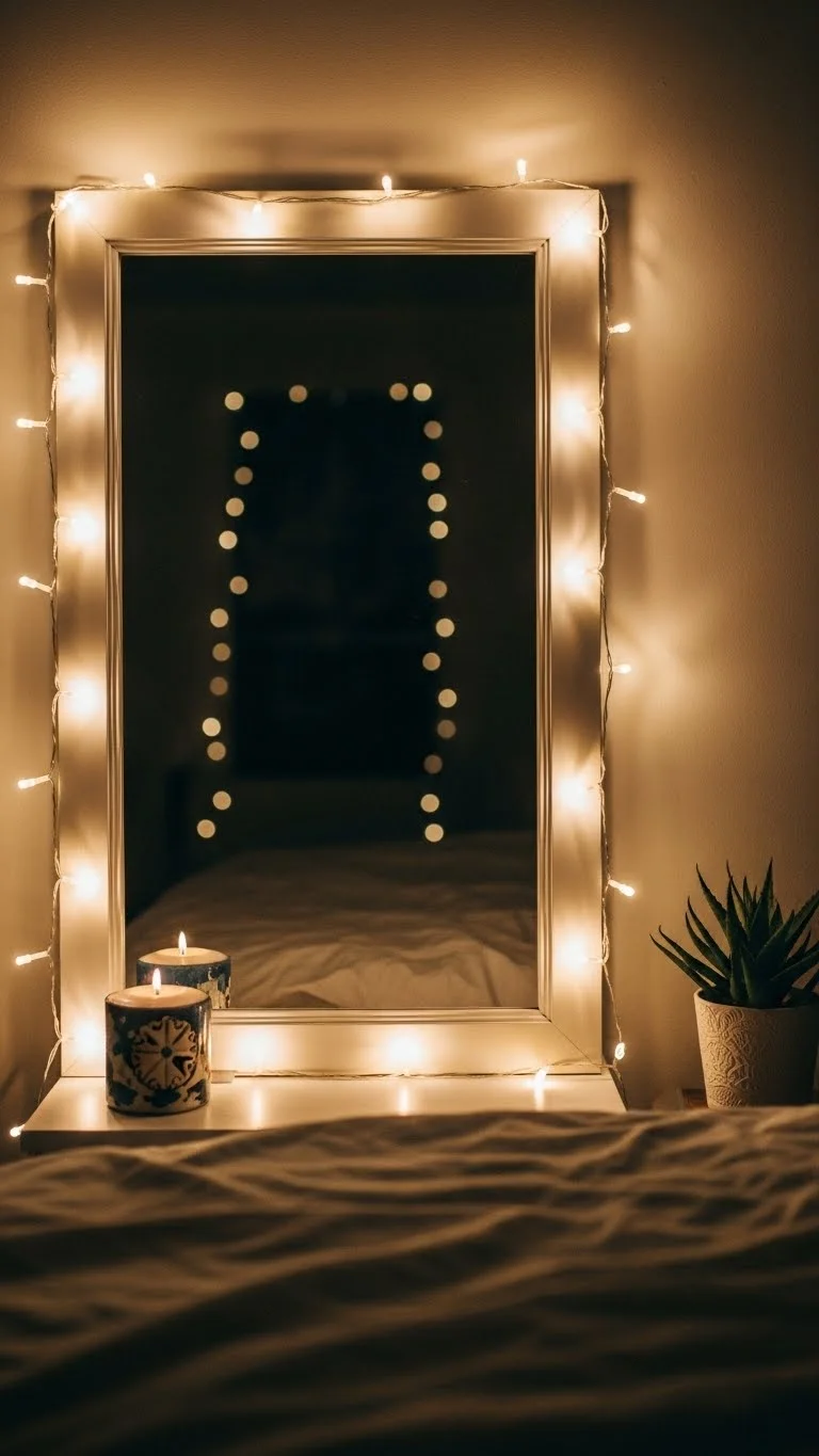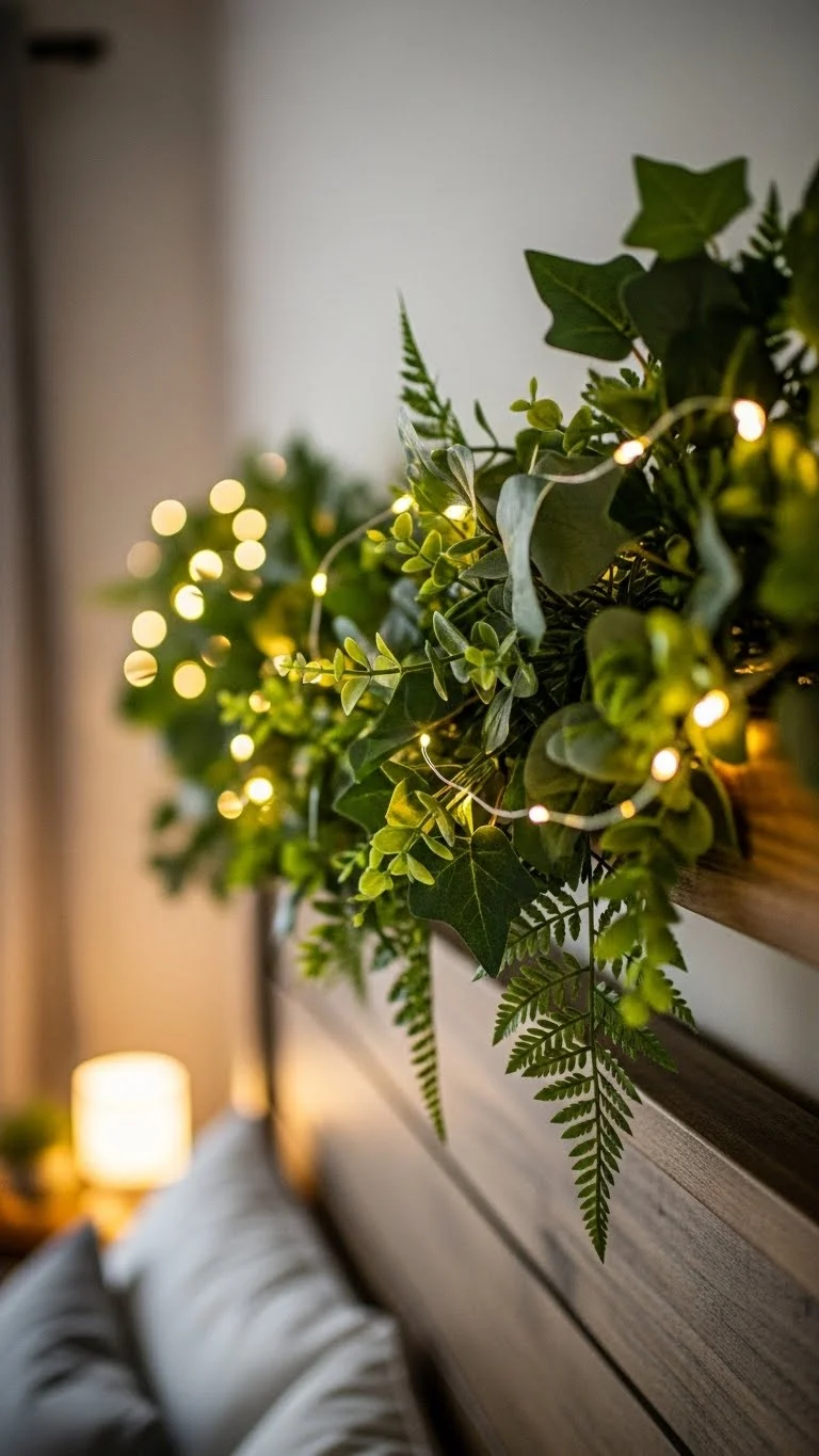 Wrap a greenery garland with fairy lights along headboards or shelves. Affordable faux garland works well. Twinkling lights enhance the cozy ambiance and add festive charm without clutter.