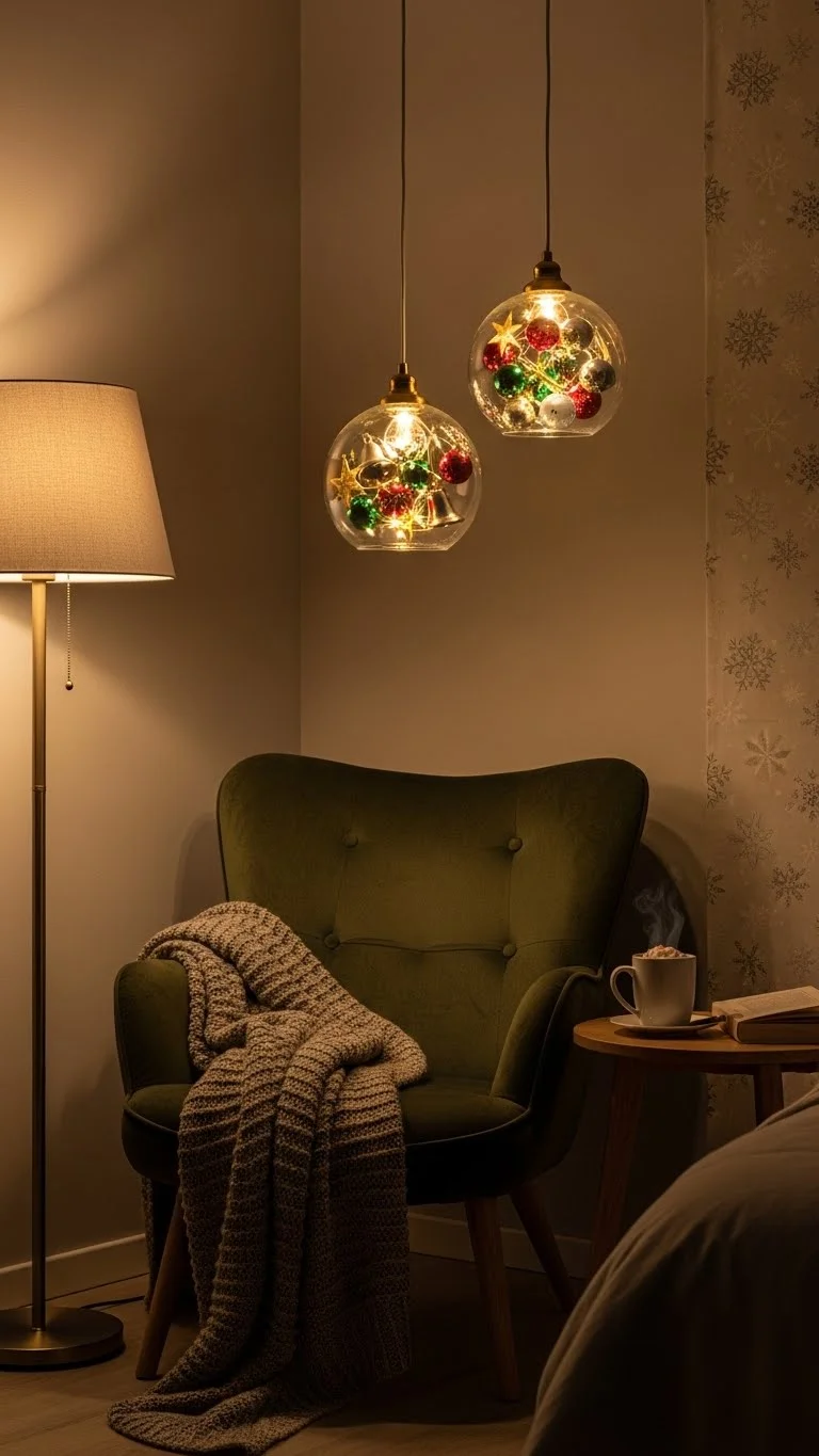Add small ornaments to pendant lights for a unique holiday touch. Affordable DIY: tie ornaments with ribbon. Lights create soft illumination while adding festive detail to corners or reading areas.