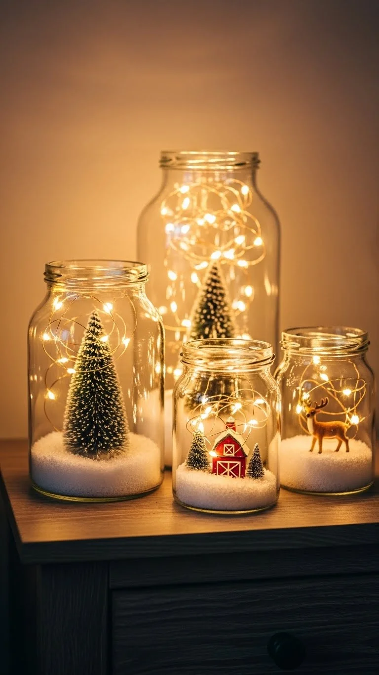 Create mini snow globe lights with jars, faux snow, and LED lights. Affordable and DIY-friendly. Adds whimsical charm and a magical holiday vibe to bedside tables or shelves.