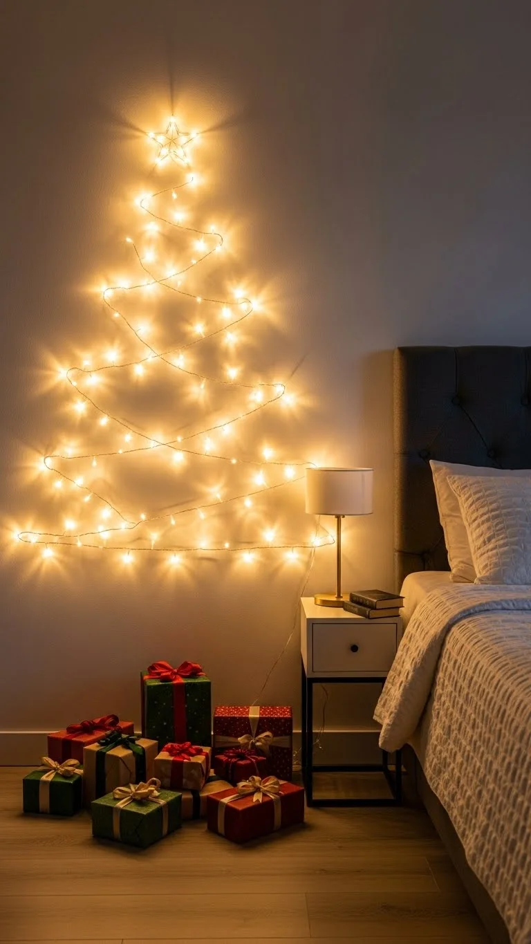 Create wall art with string lights in a Christmas tree shape. Affordable DIY: use nails or hooks to shape lights. Adds visual interest and a playful festive glow without taking up floor space.