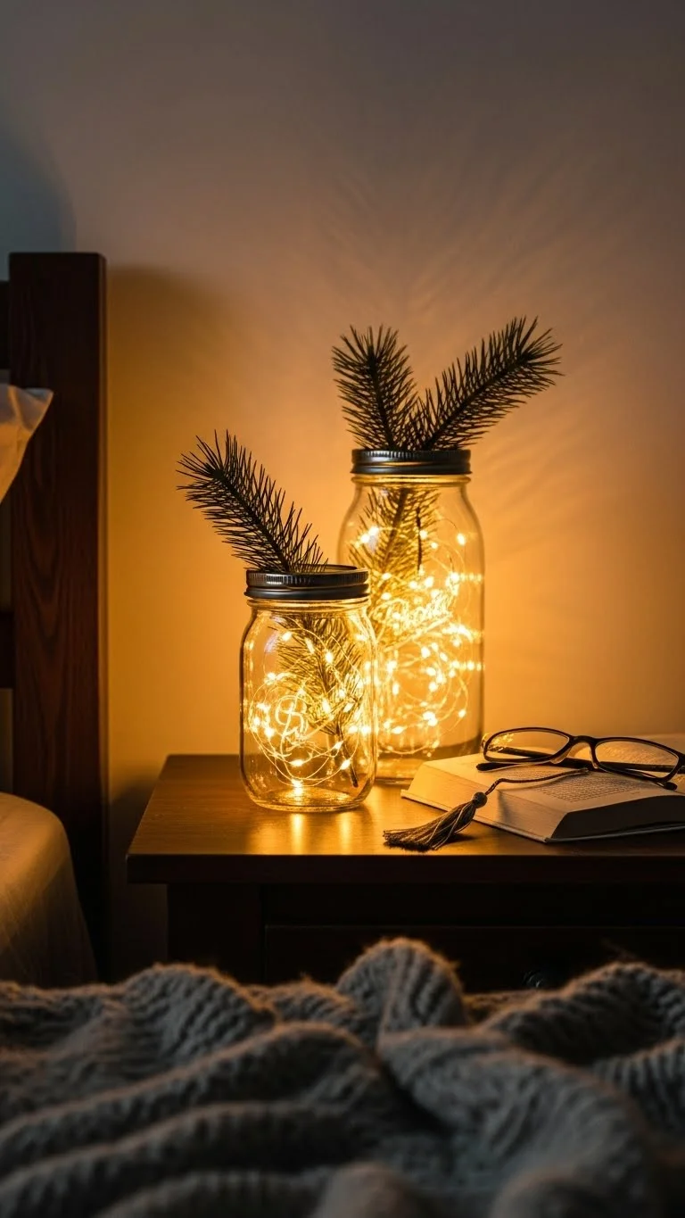 Fill mason jars with fairy lights and greenery for a charming glow. Affordable and DIY-friendly, this setup adds both light and texture. Place jars on nightstands or shelves. You can add small ornaments or faux snow for a seasonal touch. The result is cozy, magical, and budget-friendly.