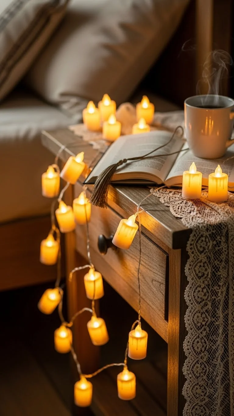 Combine LED candles with string lights for soft, flickering illumination. Battery-operated options keep it safe and flexible. Arrange along nightstands or shelves for ambient lighting. This creates a warm, relaxing atmosphere that’s perfect for winding down before bed.