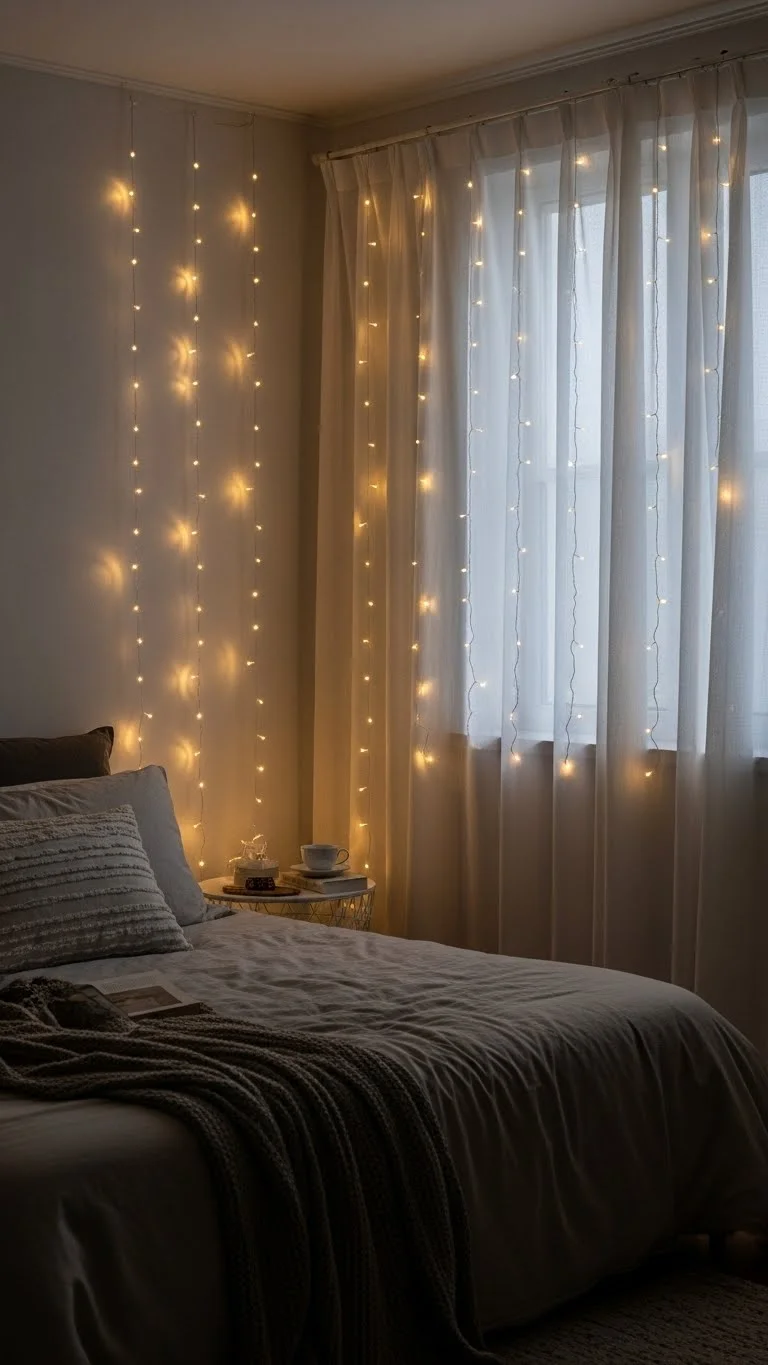 Hang LED curtain lights behind sheer curtains for a dreamy effect. Affordable, easy to install, and safe for indoor use. They create a soft backdrop, perfect for reading or relaxing. This technique gives the room a festive glow without cluttering surfaces.