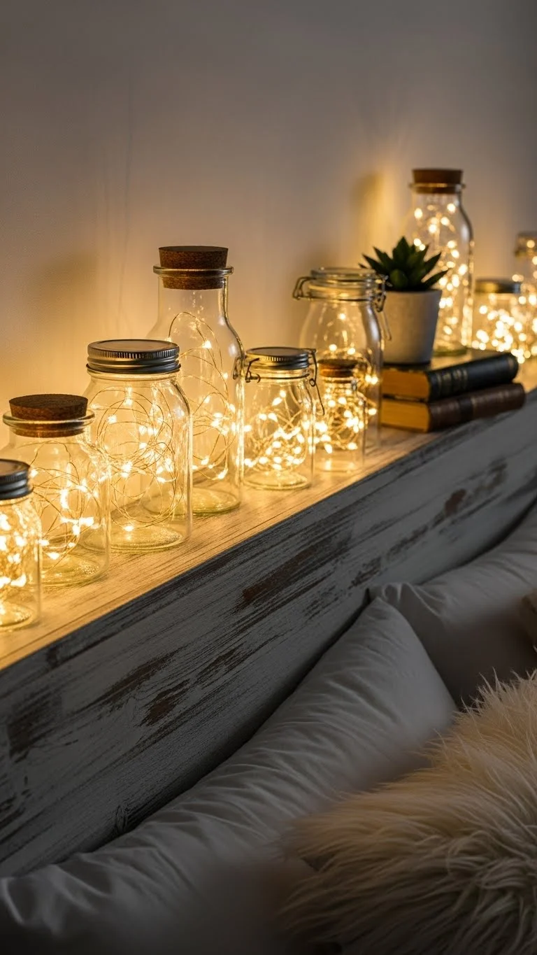 Create a twinkle jar garland by stringing fairy light-filled jars along a shelf or bed frame. Use inexpensive glass jars and battery lights. This adds charm, depth, and a playful holiday sparkle throughout the room.