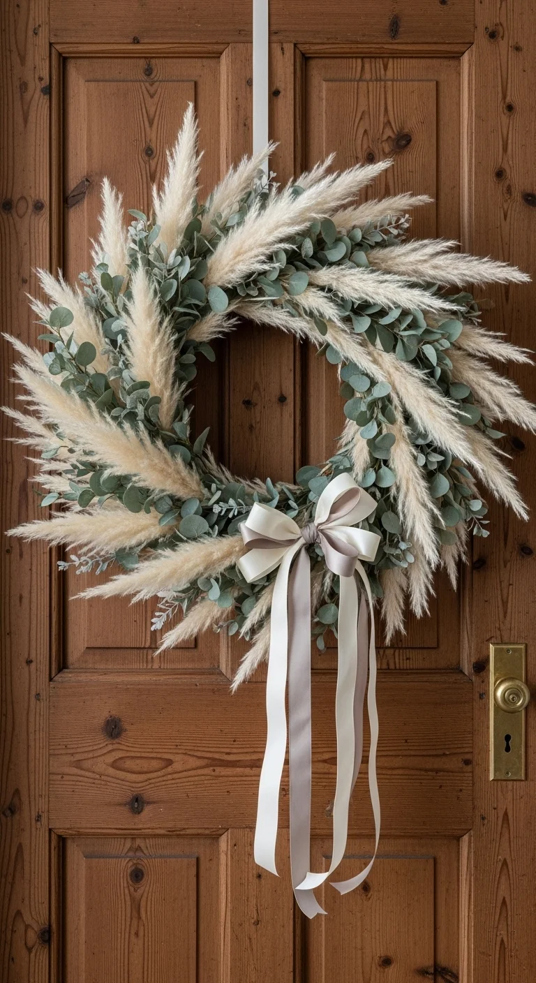 Make a boho-inspired wreath using pampas grass, eucalyptus, and dried florals. Skip the red bows and go for linen ribbons or jute twine. The muted tones make it versatile enough to stay up beyond the holidays.