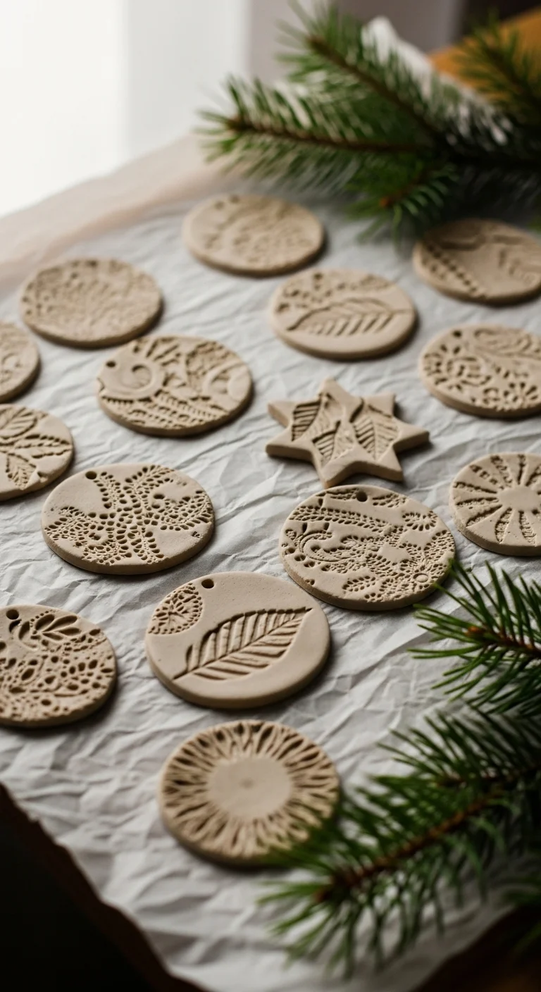 Craft air-dry clay ornaments with imprints of leaves, lace, or branches. Paint them in off-white or gold tones. They’re simple to make and add a handmade feel to your Christmas tree. This DIY is kid-friendly and inexpensive.