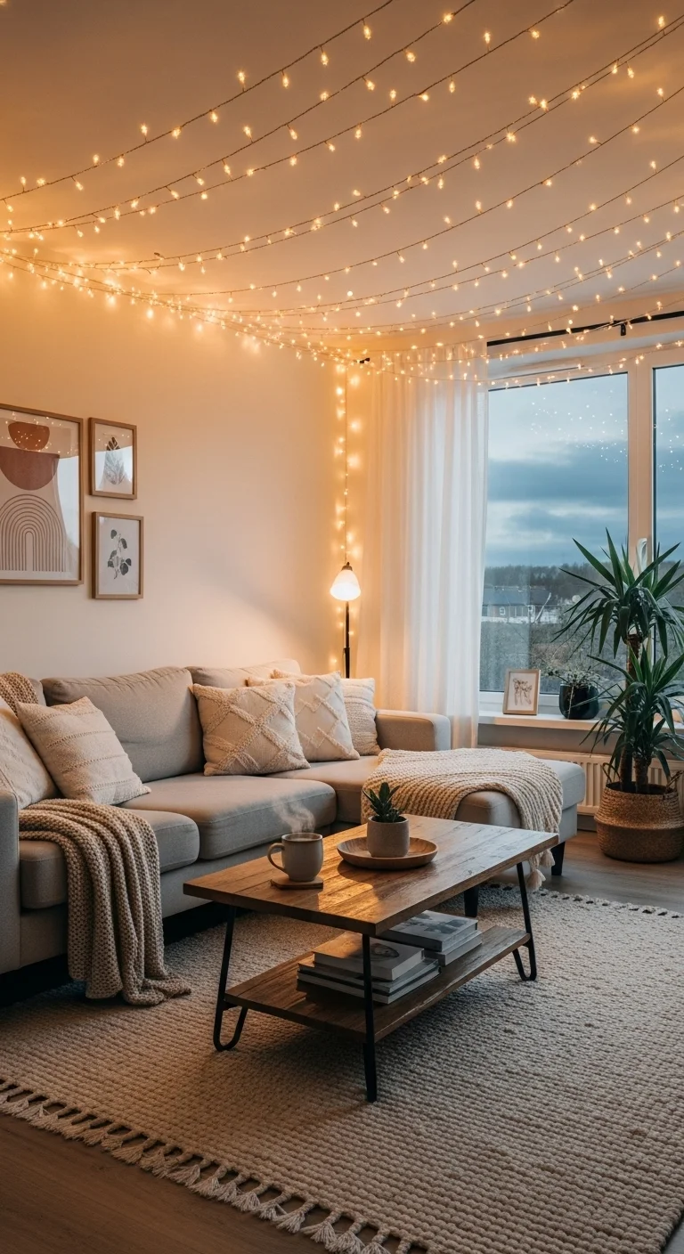 Instead of just wrapping your tree, create a string light canopy across the ceiling or wall. It spreads warm light throughout the room, creating that cozy boho glow. Use warm white bulbs to keep it soft and natural.