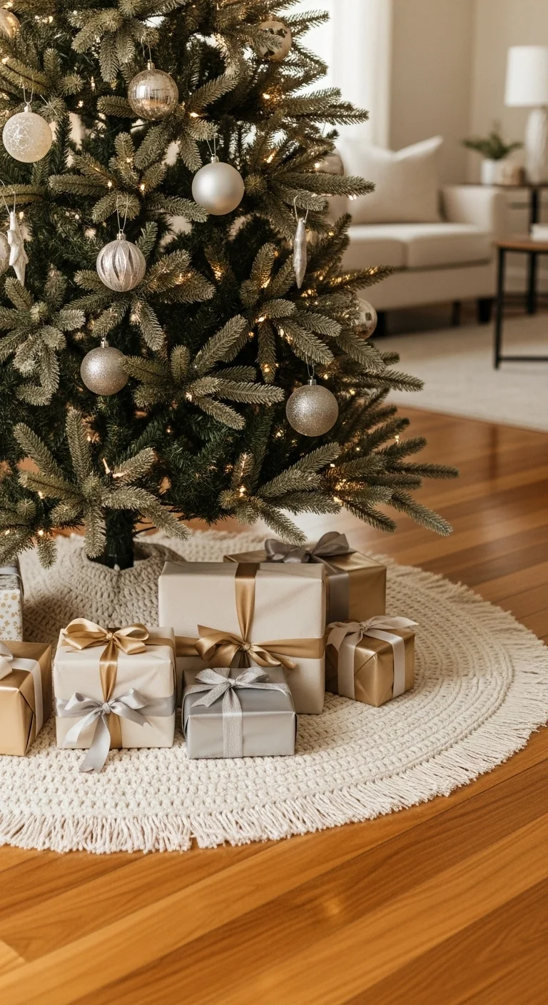 Use a fringe or macrame-style tree skirt instead of a traditional one. It keeps the base soft and relaxed. You can even make your own from leftover fabric or tassel trim for a budget-friendly option.