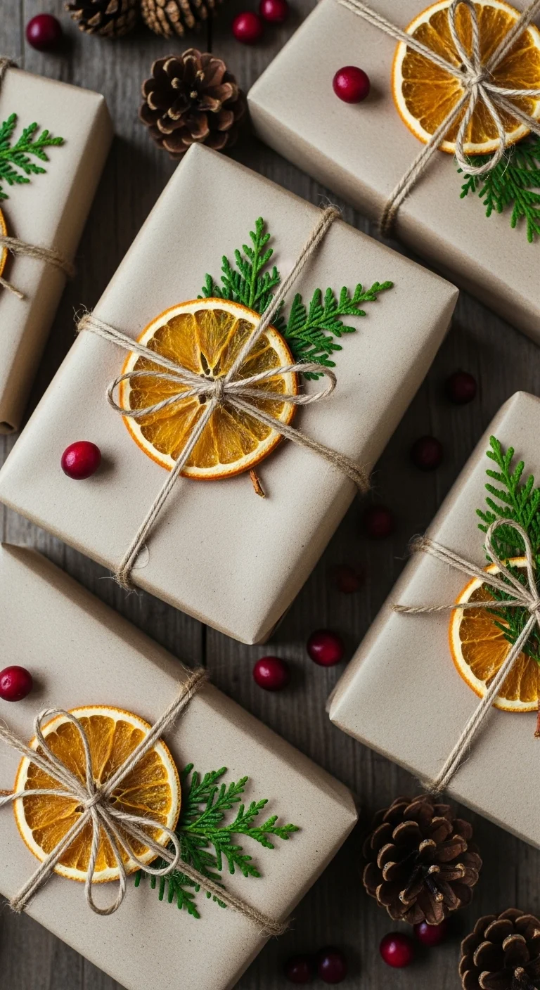 Use kraft paper and jute twine for gift wrapping. Add dried flowers or orange slices for color. This simple style feels elegant and aligns perfectly with the relaxed boho Christmas vibe.