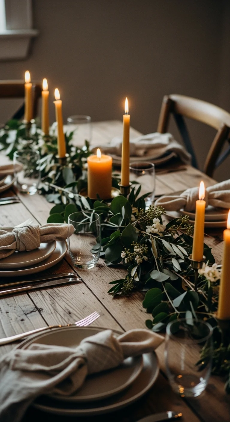 Keep your holiday table simple with linen napkins, stoneware dishes, and candles. Add a few sprigs of greenery or wooden bead accents. This makes meals feel intimate and laid-back, perfect for slow holiday gatherings.