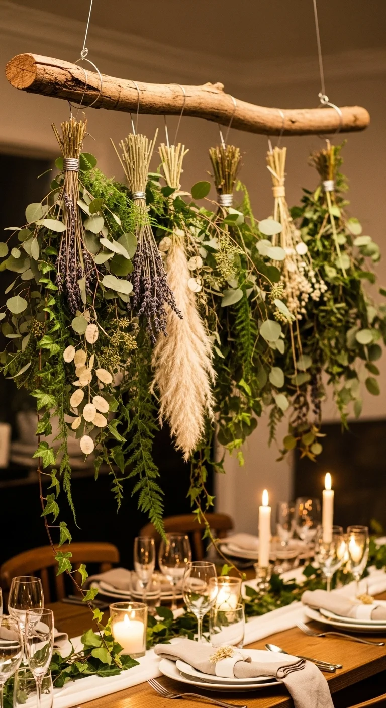 Hang greenery and dried flowers from a wooden branch or hoop above your table. It acts as a centerpiece without taking up space. This easy idea adds whimsy and natural charm.