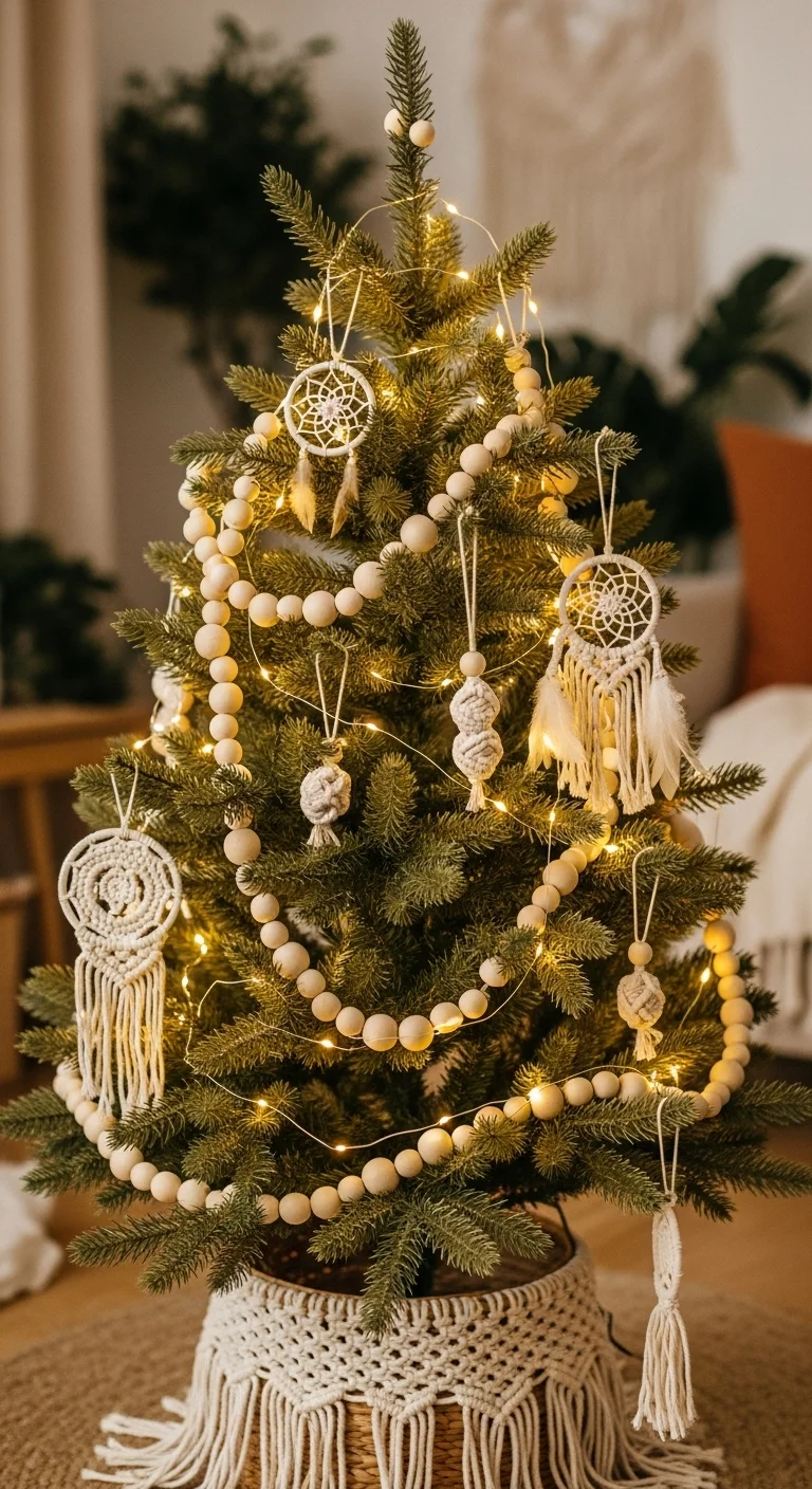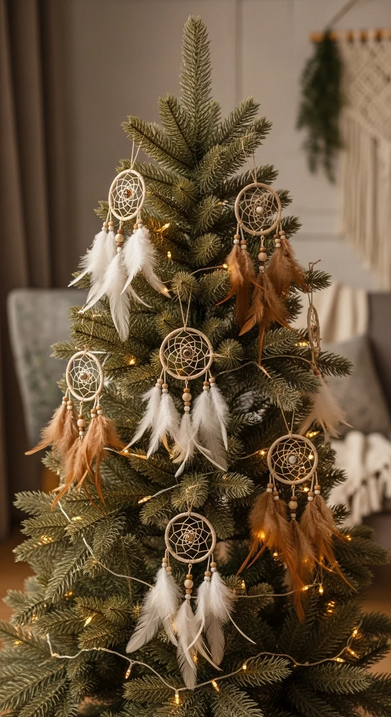 Add mini dreamcatchers as ornaments for a personal and spiritual touch. Use feathers, beads, and twine in soft neutral shades. These pieces bring a whimsical element that perfectly embodies the boho Christmas mood.