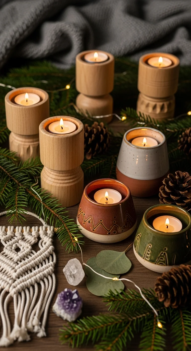 Use wood, ceramic, or terracotta candle holders for a natural touch. Group them in odd numbers on your mantel or dining table. Pair them with unscented candles in warm tones for soft lighting that feels organic and cozy.