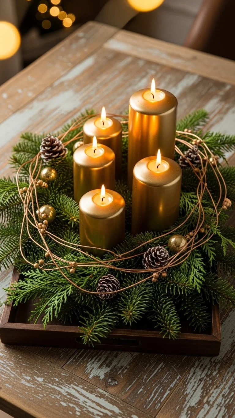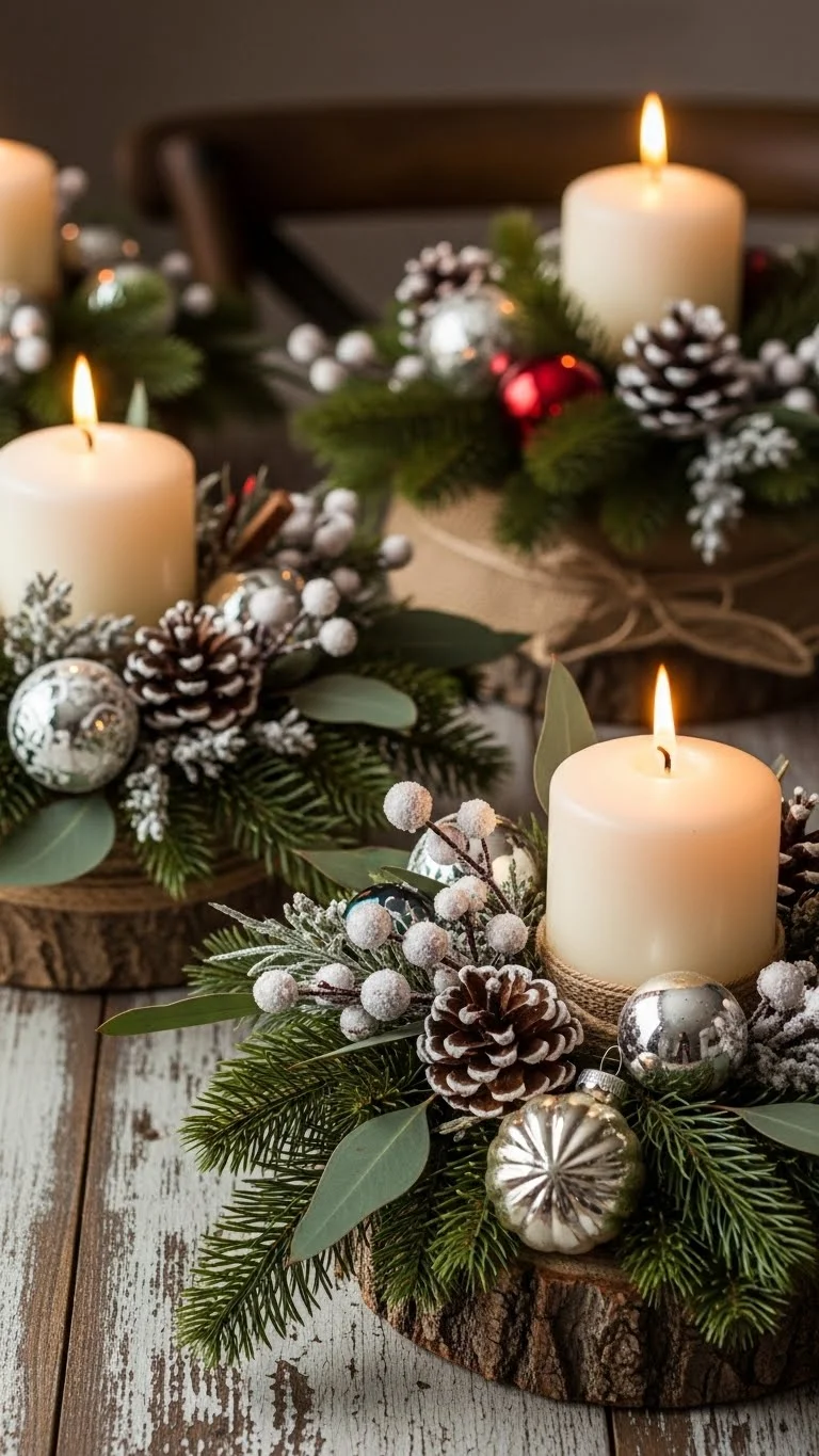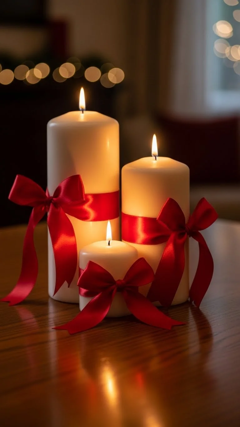 Wrap ribbon around three pillar candles and place them together on a tray. Add greenery or ornaments around the base to fill the space. This idea is quick, affordable, and easy to match with your holiday colors. Use different ribbon widths for a casual, layered look. This setup works well for both everyday dinners and holiday parties because it stays compact and tidy. Choose flameless candles if you want to leave the display lit for hours.