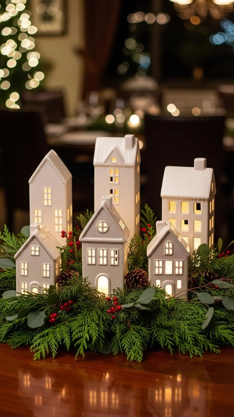 Place two or three white ceramic houses in the center of your table and weave greenery around them. Add small flameless tealights inside the houses for a gentle window glow. Keep the greenery loose so the setup feels relaxed rather than staged. This idea works well for neutral or Scandinavian-themed decor. You can mix fresh and faux greenery if you want to stretch your supplies. If the houses feel too spread out, place everything on a long wooden board to give it a clean base.