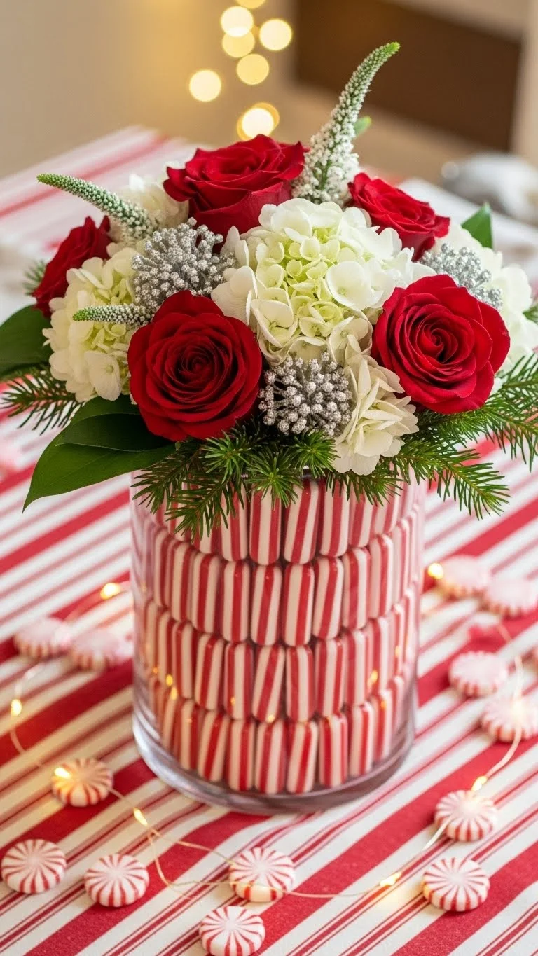 Line a clear vase with wrapped peppermint candies to create a fun, colorful look. Slide a smaller cup inside the vase to keep the candies in place, then fill it with flowers or greenery. This creates a festive layer without complicated steps. Use inexpensive blooms like baby’s breath or carnations to keep the project budget-friendly. The candy lining makes the display stand out even with simple flowers. This centerpiece works well for casual dinners or kids’ holiday parties because the colors feel cheerful and seasonal.