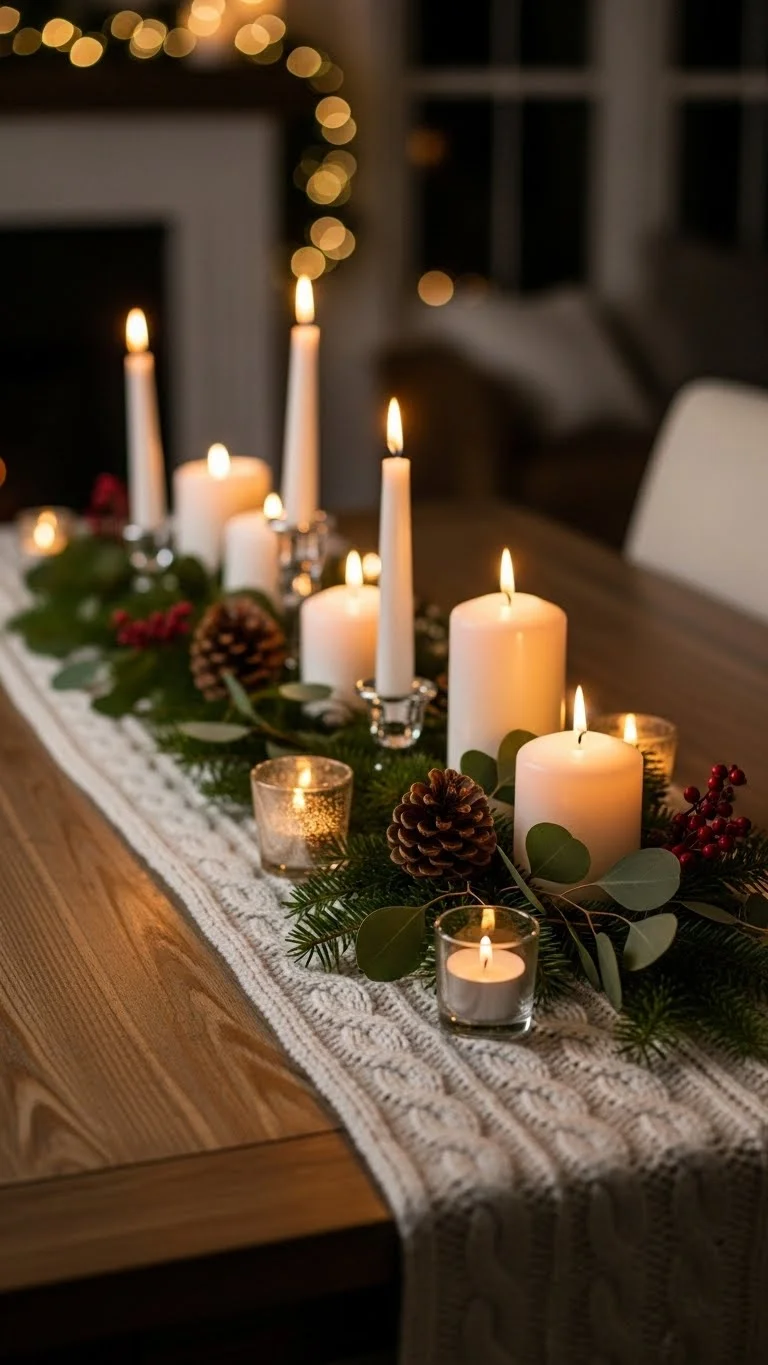 Lay a chunky knit runner along the center of your table and place a cluster of candles on top. Add greenery around the base of the candles for a soft, wintery finish. The knit texture creates warmth without adding clutter. Choose neutral colors like cream or gray so the lighting stands out. This idea works well for long tables and keeps everything low for easy conversation. Try mixing candle shapes for variety. Use flameless candles if you want to avoid melted wax on the fabric.