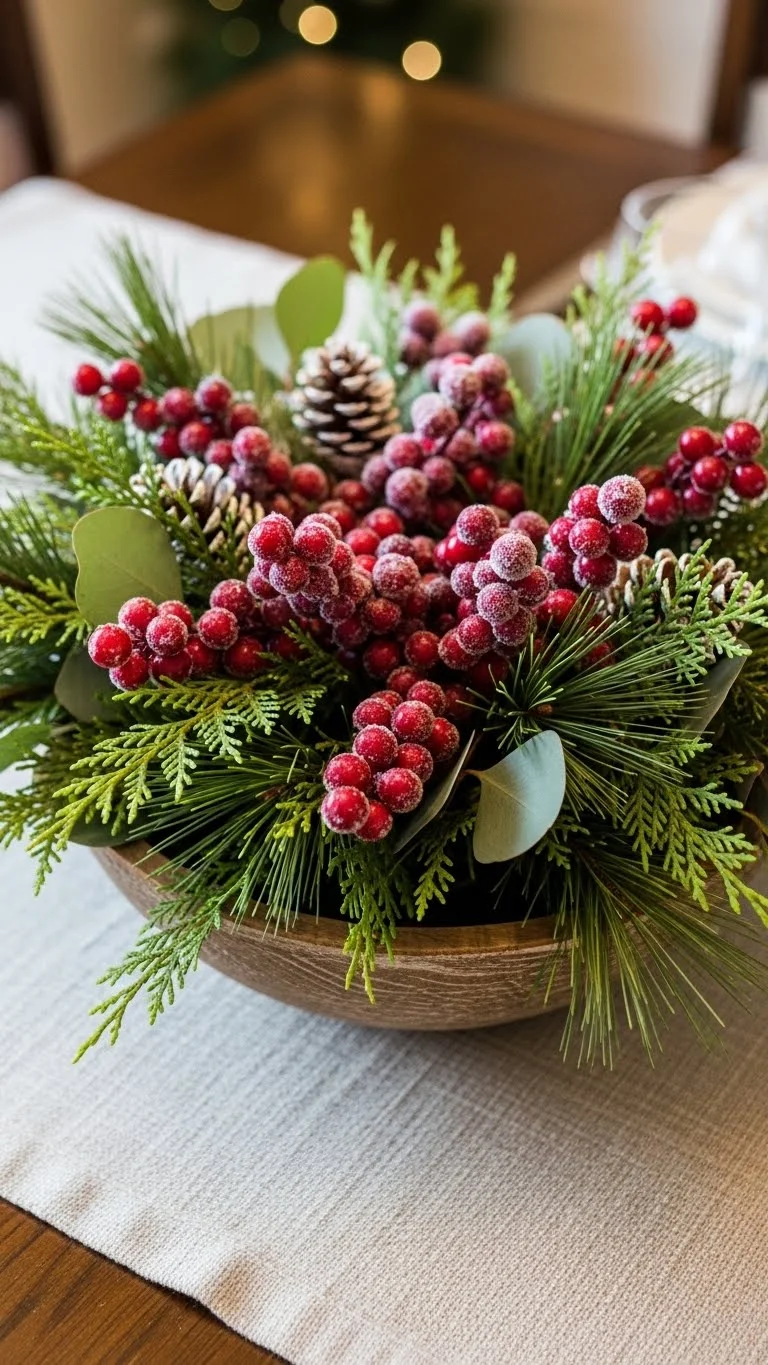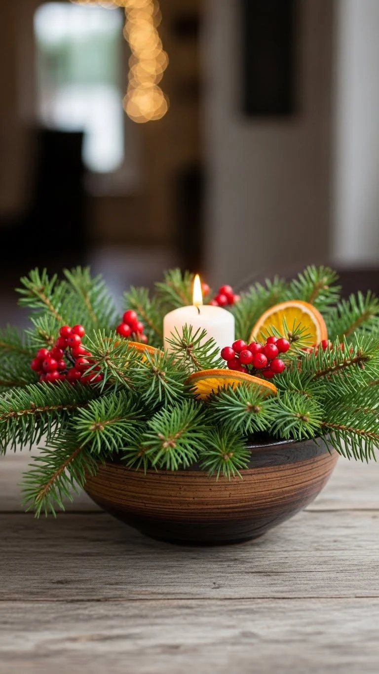 Fill a shallow ceramic bowl with clipped greenery. Mix pine, cedar, or eucalyptus to create soft layers and natural movement. If you want height, add one or two stems in the center, but keep everything low so it stays table-friendly. This setup works well when you want something simple and natural without extra color. Mist the greenery lightly before guests arrive to keep it looking fresh. If the bowl feels plain, add one ornament or a few berries for a hint of color.