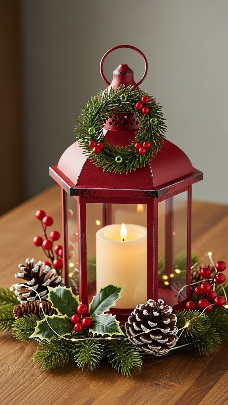 Place a red lantern in the center of your table and nest it inside a small wreath made of greenery or berries. Add a flameless candle inside so the lantern glows through dinner. This idea works well for rustic, farmhouse, or traditional decor styles. The wreath keeps the lantern from looking too tall or plain. You can also add a bow or ribbon to the top for extra charm. If your table is long, place two smaller lanterns instead of one large one.
