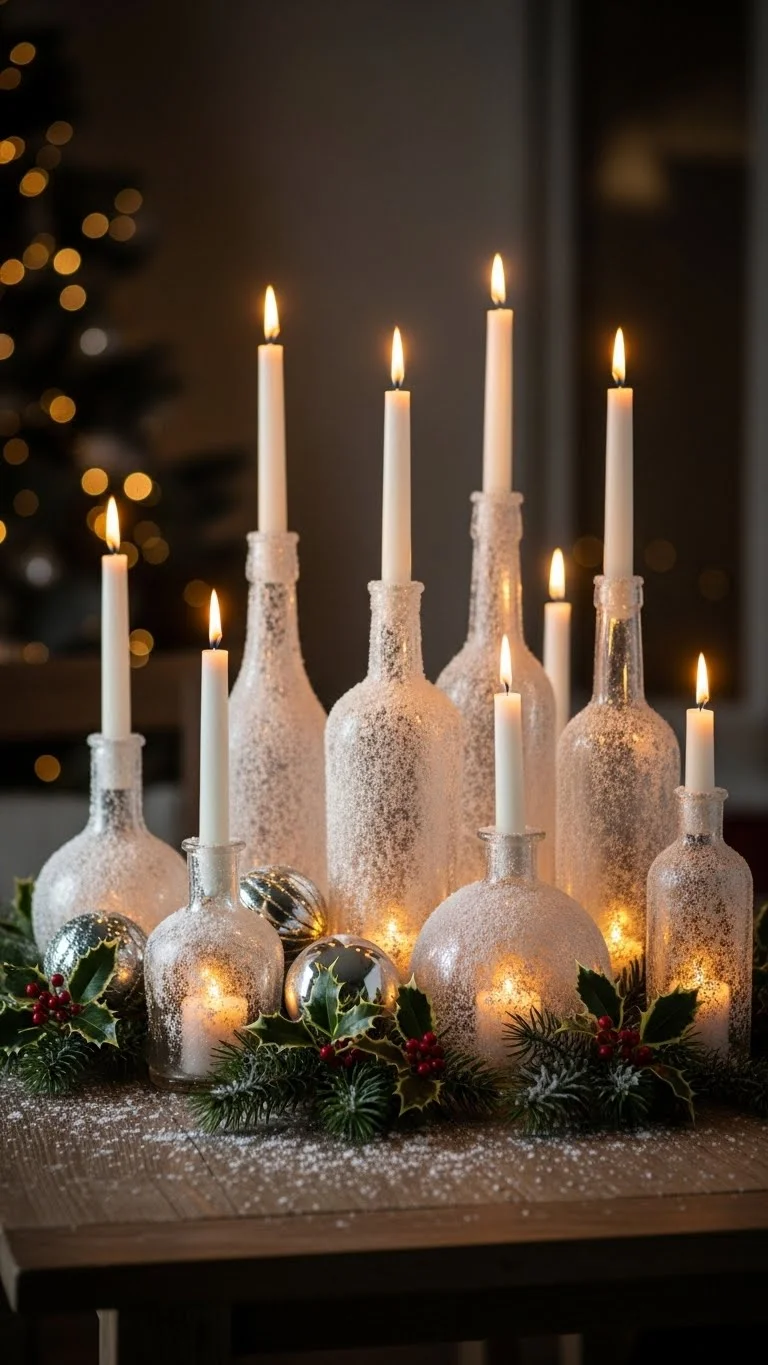 Save a few glass bottles and spray them with a frosted finish. Insert taper candles into the openings and group the bottles on a tray or wooden board. Add greenery around the base for a clean, wintery look. This idea is inexpensive and perfect for long tables because the bottles create height without heaviness. You can mix clear and frosted bottles for a soft contrast. Keep the candles unscented so they don’t compete with dinner.