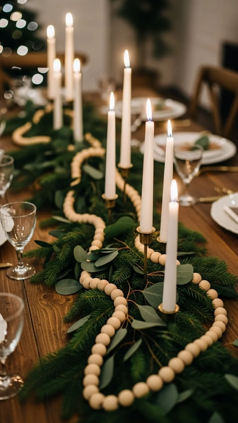 Lay a wooden bead garland along the center of your table and place taper candles between the beads using small holders. Add greenery around the base for color. This look is simple but warm, and the beads create a soft texture that pairs well with minimalist or neutral decor. Use different candle heights if you want the display to feel more dynamic. This idea stays low enough to keep conversation easy across the table.