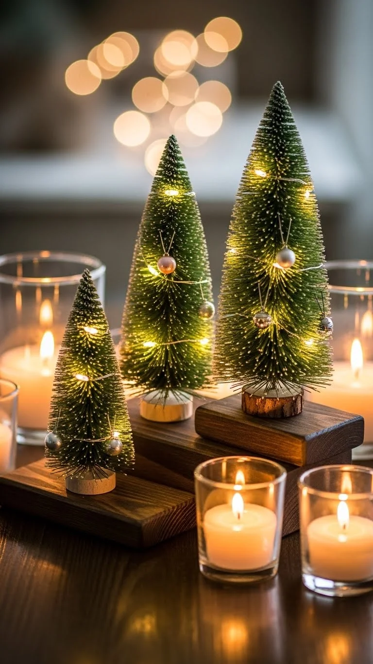 Arrange three mini Christmas trees in the center of your table. Mix sizes and colors for variety. Add a few candles or ornaments around the base to create a tiny winter forest. This idea works well for long or round tables because it’s easy to scale up or down. If the trees feel too small, place them on a riser or cutting board to give the setup more presence. This is a great budget-friendly option if you already use mini trees in your decor.