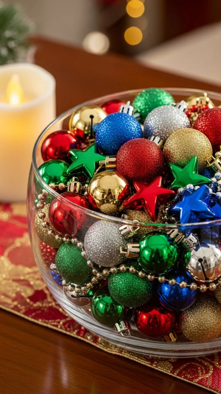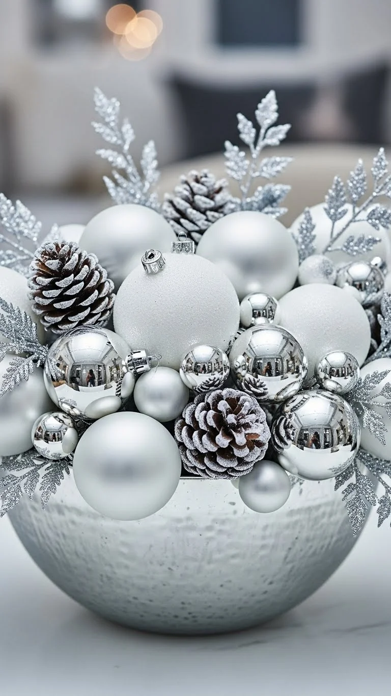 Fill a bowl with white ornaments and silver accents to create a snowy, wintery look. Add a few frosted picks or faux snow for texture. This display works well with modern or elegant holiday themes. Use ornaments in different sizes so the bowl doesn’t look flat. If you want a softer look, mix in greenery around the edges. Place the bowl on a runner to make it stand out more on dark tables.