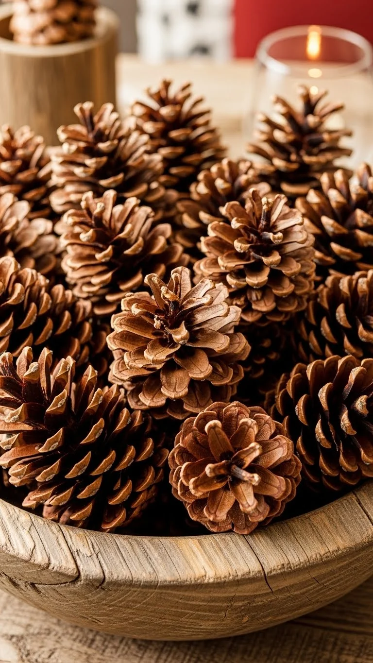 Fill a wooden bowl with pinecones to create a cozy, forest-inspired centerpiece. Mix sizes and shapes to keep it interesting. You can gather pinecones from your yard or buy a small bag if you live in an area without them. Add cinnamon sticks for scent or tuck in a few metallic ornaments for sparkle. This look works well with farmhouse, Scandinavian, or simple holiday themes. It also makes a great last-minute option if you’re short on time. If the bowl feels too deep, place a small cloth napkin at the bottom to raise the cones slightly and improve the shape.