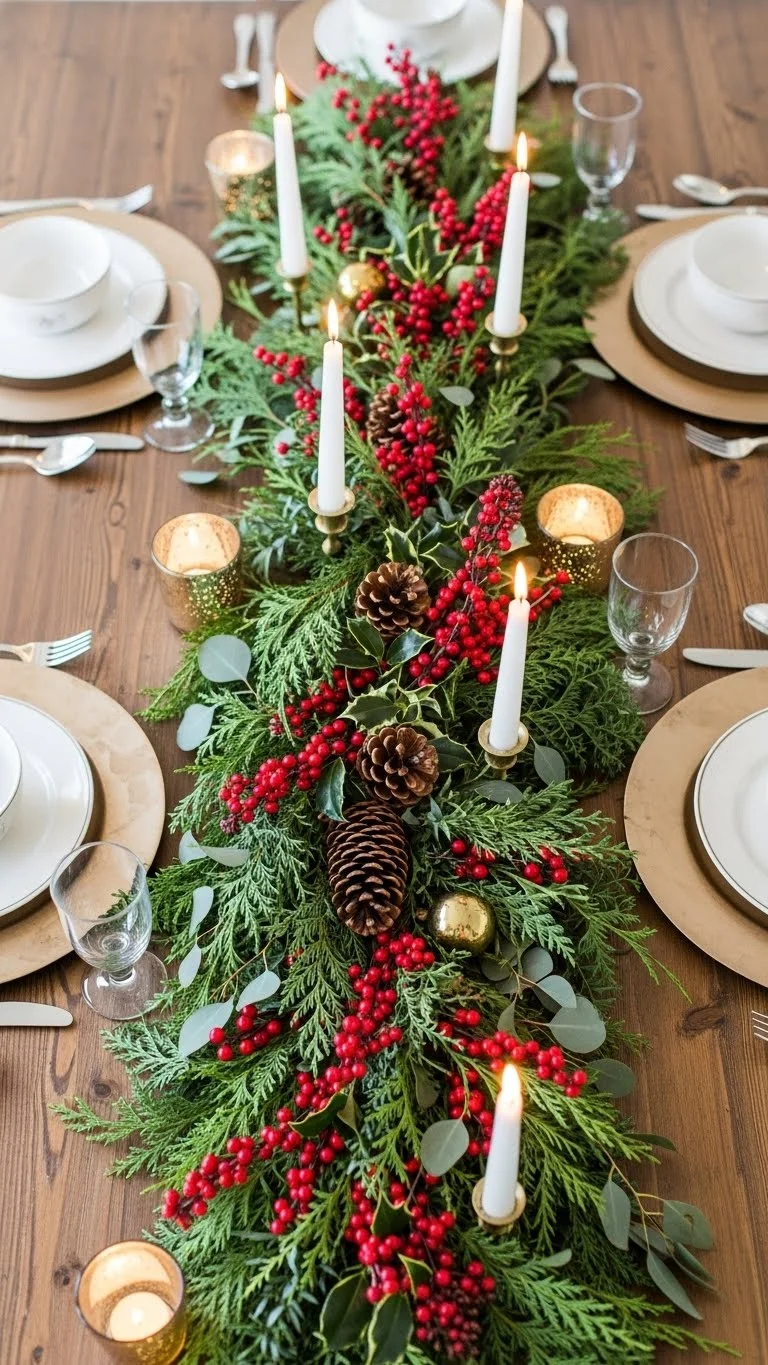 Lay a strand of faux berries and greenery down the center of your table to create a simple holiday runner. Add a few votives along the line for soft light. This centerpiece works well for long tables since it stretches naturally without looking busy. You can use leftover garlands from your mantel or staircase to save money. If the berries feel too bright, mix in neutral greenery to balance the color. This setup pairs well with white plates and wooden chargers for a warm and inviting table.