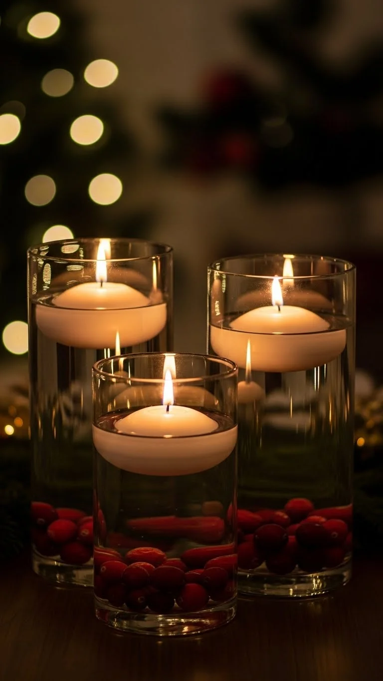 Arrange three glass vases of different heights and fill them with water. Drop in cranberries or small ornaments, then add floating candles on top. The result looks polished without effort. Keep the vases close together so the candles create a shared glow. This idea works well for round tables because it stays centered and contained. If you want subtle variation, add one sprig of evergreen inside a vase for a touch of green. Be sure the candles are unscented so they don’t overwhelm dinner.