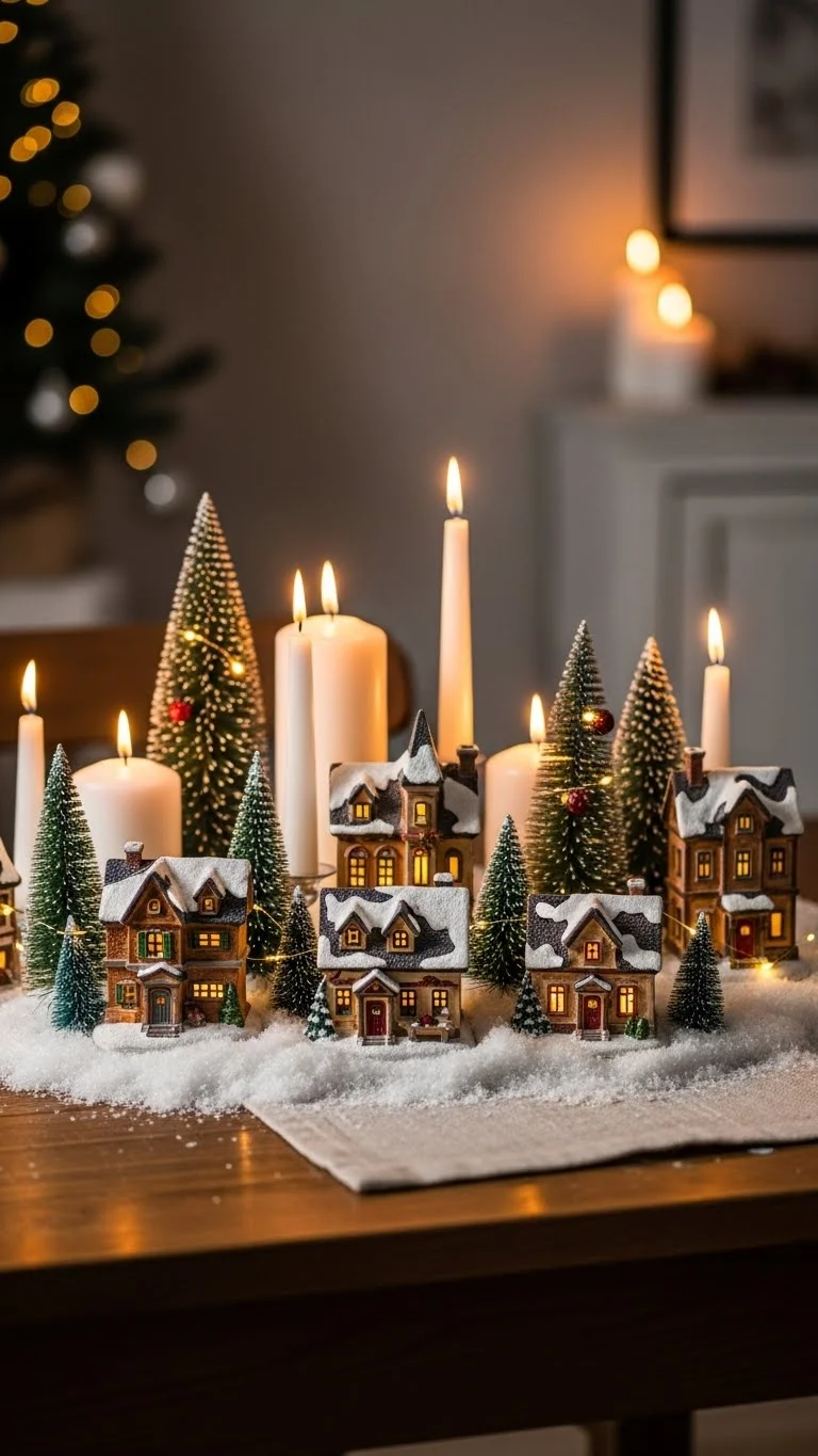 Use miniature village houses to build a cozy winter scene in the center of your table. Sprinkle faux snow around them and tuck in a few bottle-brush trees. Add flameless candles for warm light without heat. This idea works well for family dinners because kids love the tiny details. Keep the display low so it doesn’t block conversation. You can reuse pieces from your mantel or shelf displays to save money. For a gentle finishing touch, place everything on a tray so it’s easy to move when serving food.