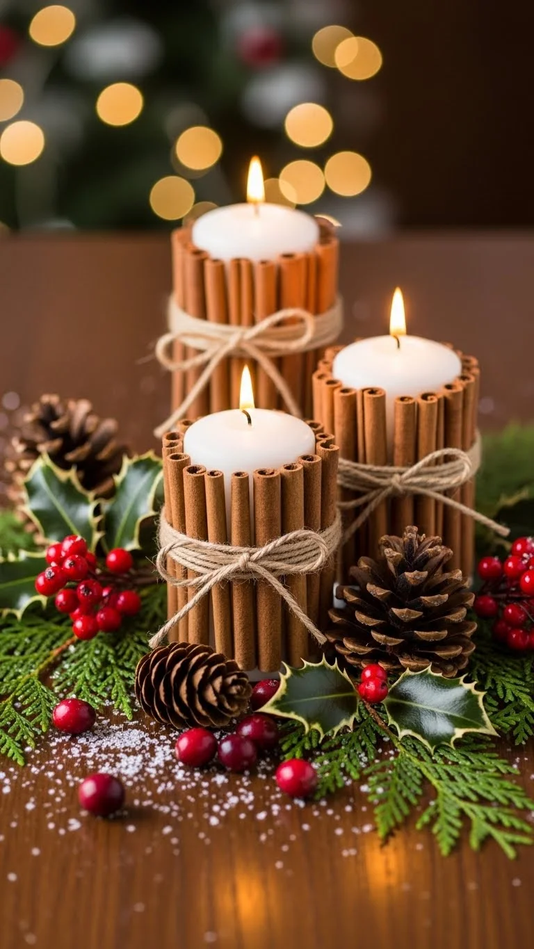 Wrap cinnamon sticks around pillar candles using twine for a warm, rustic look. Place the candles on a small board or tray and add a few evergreen sprigs around the base. The scent is gentle and feels cozy without being overwhelming. This project is inexpensive and takes only minutes. Use three candles of different heights for a balanced layout. Keep the sticks slightly uneven for a natural feel. This centerpiece works especially well on kitchen tables or informal dining setups.