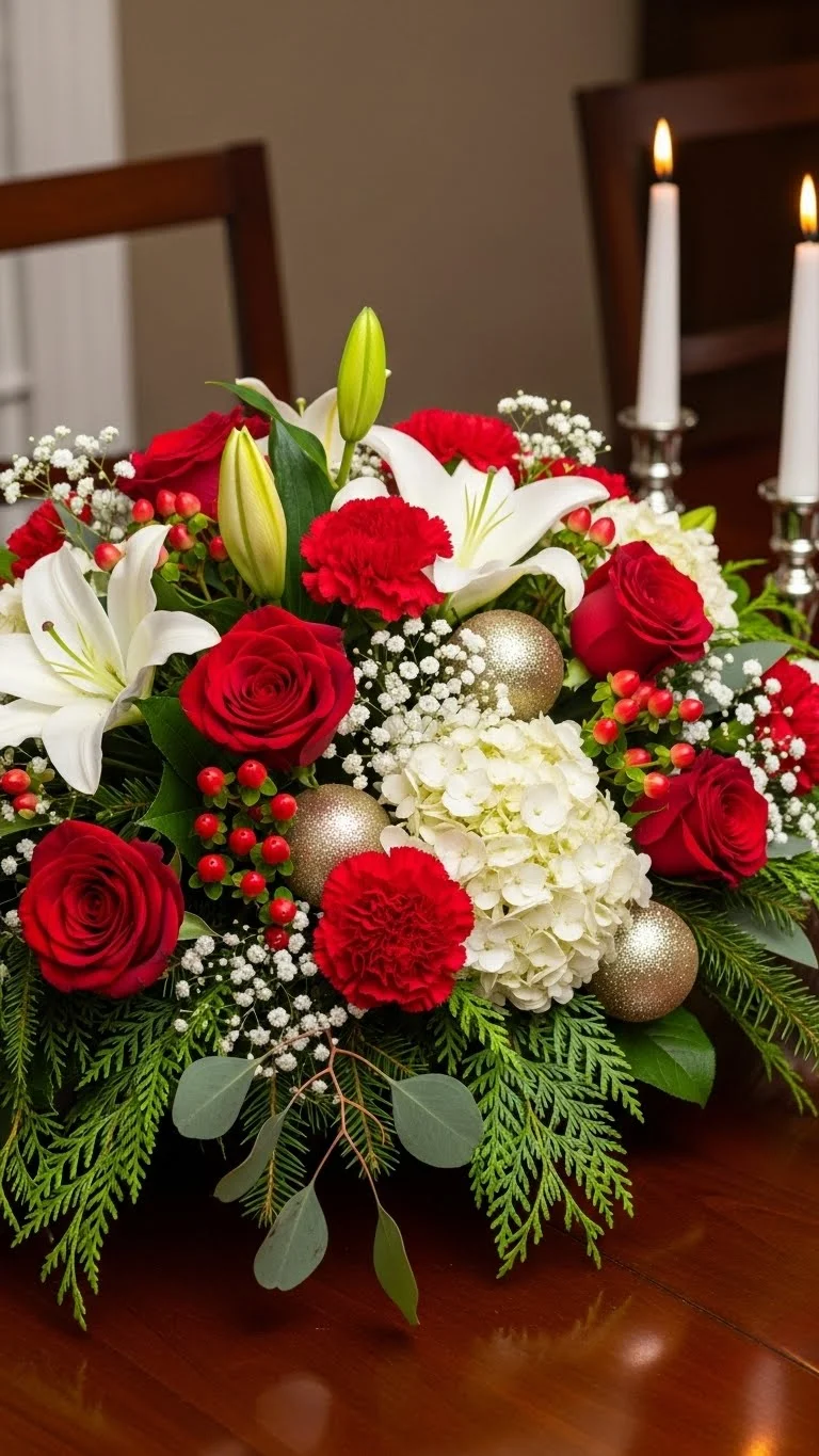 Arrange red and white flowers in a simple vase with plenty of greenery. Choose blooms like carnations, roses, or mums, which are affordable and easy to find. Keep the arrangement loose to avoid a stiff look. Add a few berries or pine picks if you want extra texture. This design works well with traditional Christmas colors and blends nicely with most table settings. If you’re on a tight budget, mix real greenery with one or two faux stems to bulk up the shape.