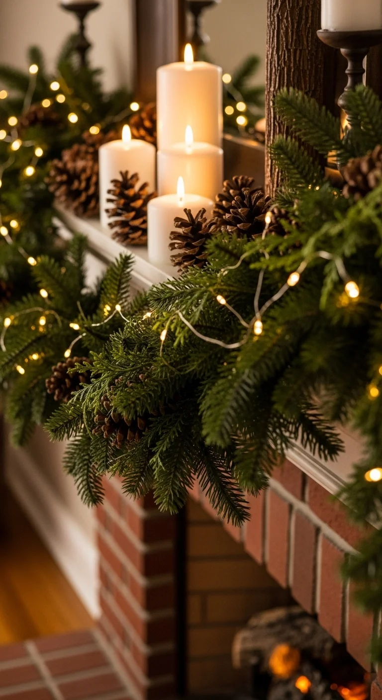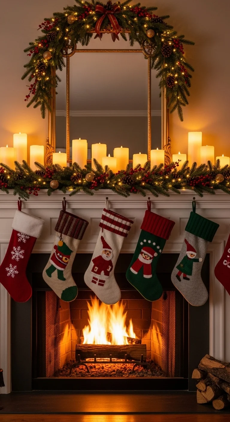 Dress up your mantel with layers of charm. Use greenery, stockings, and candles of varying heights. Add small wooden houses or fairy lights for a cozy village look. Keep colors consistent for harmony—try whites and golds or reds and greens.