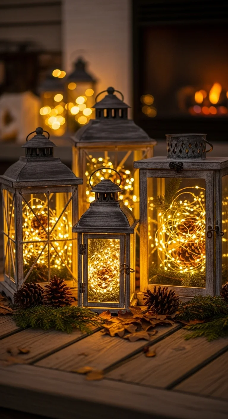 Lanterns instantly create atmosphere. Fill them with fairy lights, candles, or ornaments and place them along pathways, mantels, or stairs. You can repaint old lanterns in matte black or white for an updated look. They’re reusable every season and perfect for adding soft, glowing light indoors or out.