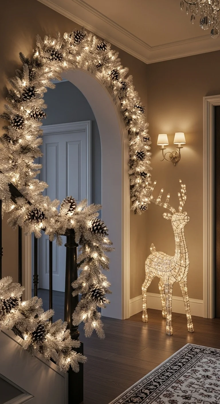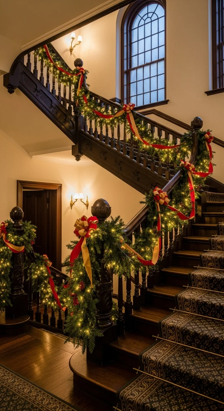 Transform your stairs with garlands and twinkle lights. Wrap greenery around the banister and tie bows at intervals. For a personal touch, hang mini stockings or ornaments with family names. It’s an easy project that makes your whole home feel more festive.