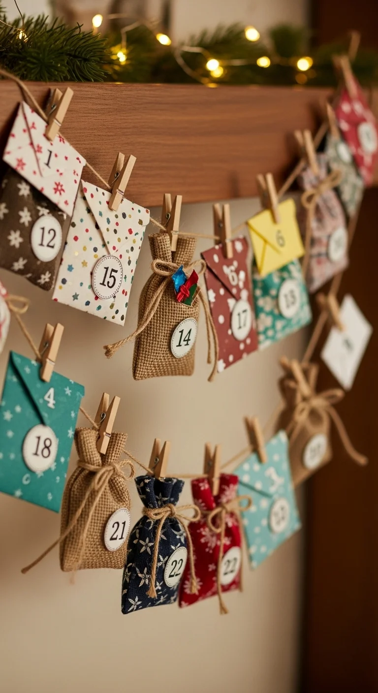 Craft an advent calendar using envelopes, paper bags, or boxes. Fill them with small treats or daily notes. Hang them with string and clips across a wall or mantle. It’s personal, budget-friendly, and adds excitement all month long.