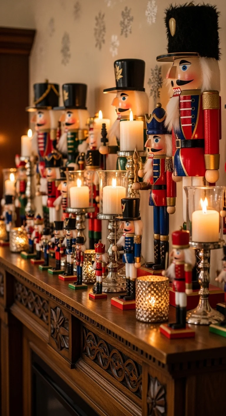 Show off nutcracker figurines for a traditional touch. Mix classic reds and golds or repaint thrifted ones in modern hues. Line them along a mantel or shelf for instant character. They’re timeless, collectible, and loved by both kids and adults.